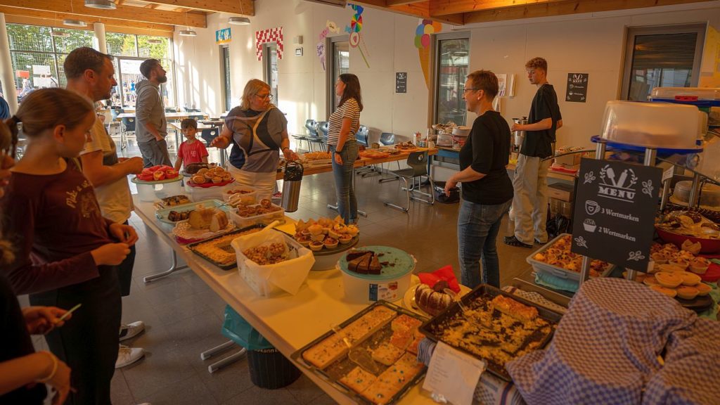 Viele Ehemalige nutzten die Gelegenheit, ihre alte Schule wiederzusehen, frühere Lehrkräfte zu treffen und in Erinnerungen zu schwelgen. Natürlich war auch fürs leibliche Wohl bestens gesorgt: Es gab Pizza, Bratwürstchen, Eis und Getränke. In der Cafeteria boten Eltern liebevoll gebackene Kuchen an. Ein großes Dankeschön geht an alle Helferinnen und Helfer, die beim Auf- und Abbau, an den Ständen oder in der Organisation mitgeholfen haben – ohne euch wäre das schöne Schulfest nicht möglich gewesen!