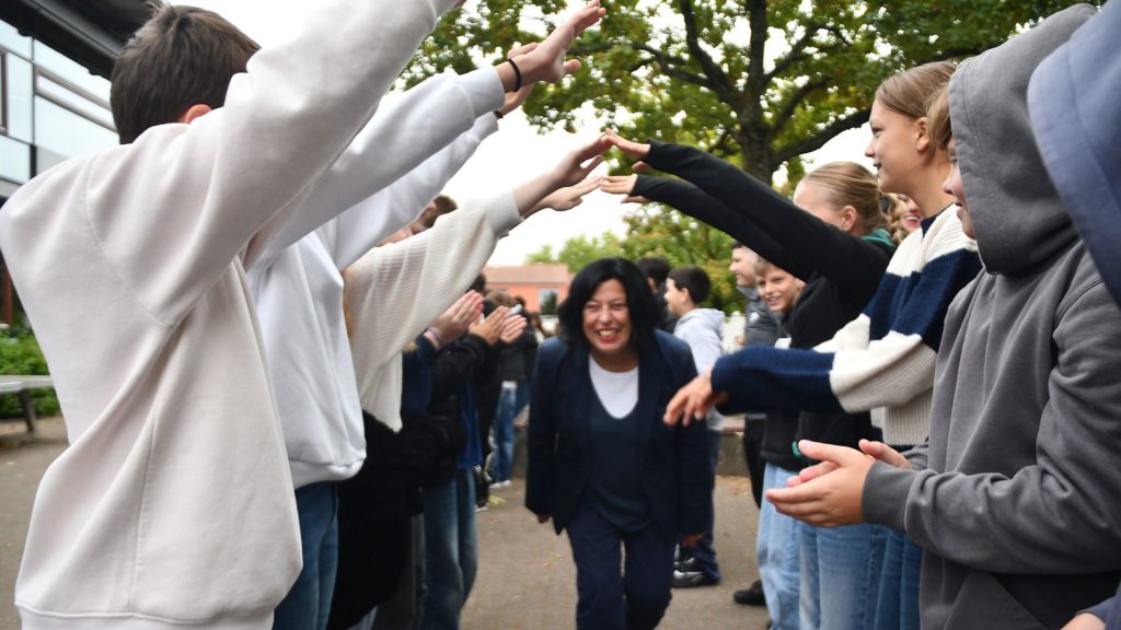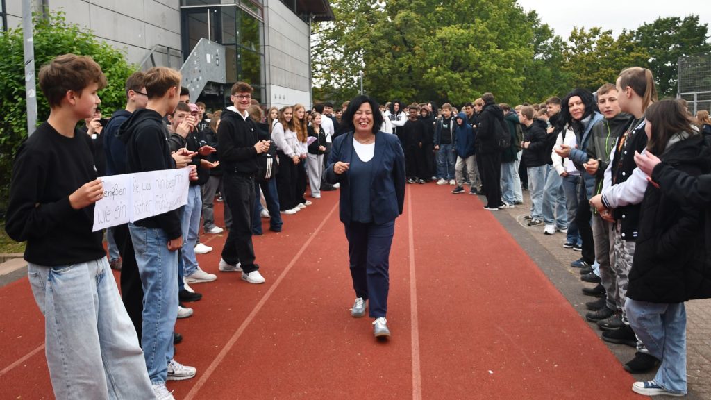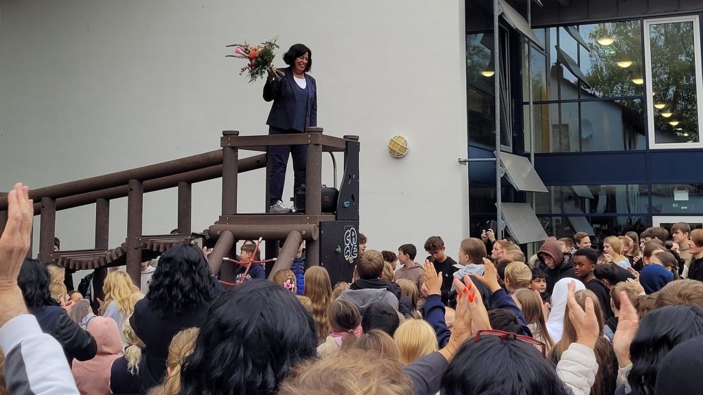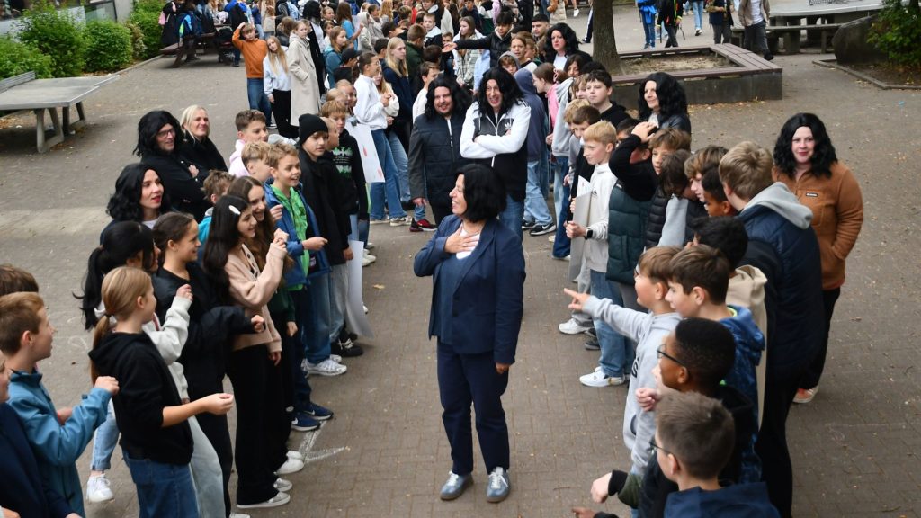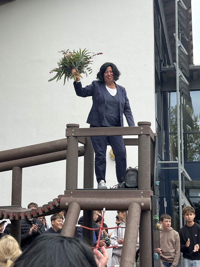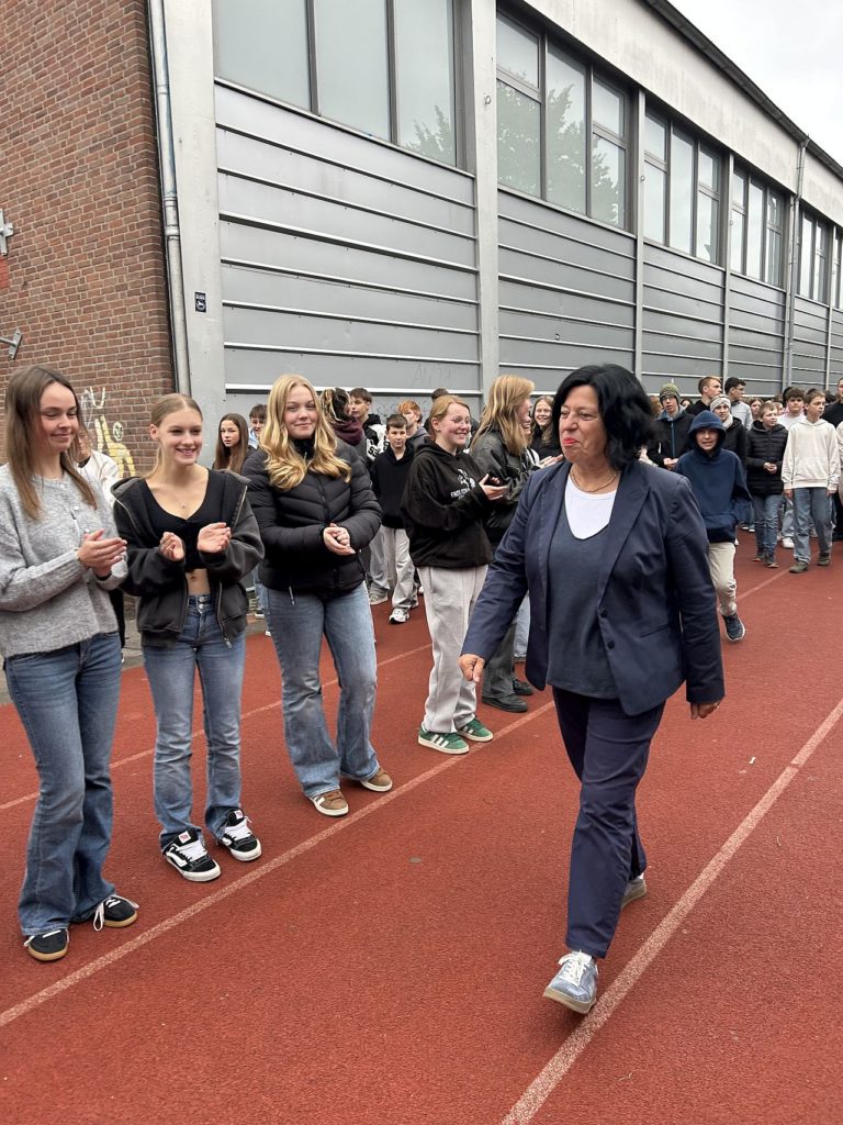 Am Vormittag standen die Schülerinnen und Schüler mit ihren Klassenleitungen Spalier. Dabei richteten alle Klassen nette Grußworte zur Verabschiedung an unsere Schulleiterin. Ganz besonders in Erinnerung wird wohl bleiben, dass sich nahezu alle Kolleginnen und Kollegen als Frau Diel verkleidet hatten. Mit Lippenstift, Blazer und stilechter Beatrix-Diel-Gedächtnis-Perücke sorgten sie für einen echten Gänsehautmoment an diesem Tag. Das Spalier endete am Klettergerüst, wo unsere Schülersprecherin und unser Schülersprecher schon auf Frau Diel warteten. Voller Wertschätzung verabschiedeten sie sich ebenfalls. Frau Diel ließ es sich im Anschluss natürlich nicht nehmen sich von der gesamten Schülerschaft, die sich vor dem Klettergerüst eingefunden hatte, zu verabschieden. Gespannt lauschten alle ihrer Rede – so leise war es noch nie auf dem Schulhof.