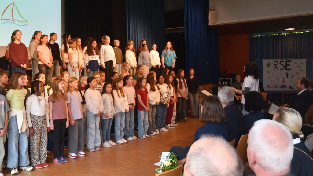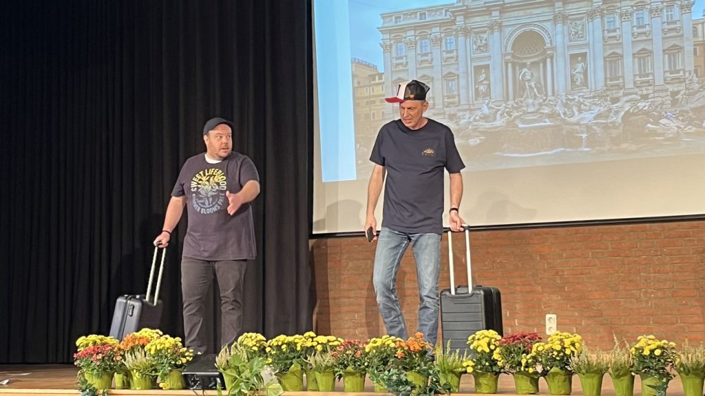 Am Mittag folgte dann die offizielle Verabschiedung in der Aula. Nach einem tollen und emotionalen Auftritt unseres Schulchores führten Herr Heidkamp (1. Konrektor) und Herr Bodi (2. Konrektor) durch das Programm. Sie bauten ihre Moderation in Form einer „verzweifelten“ Suche nach ihrer Chefin von Enger bis nach Italien auf. Sie suchten damit die Lieblingsorte von Frau Diel auf.
