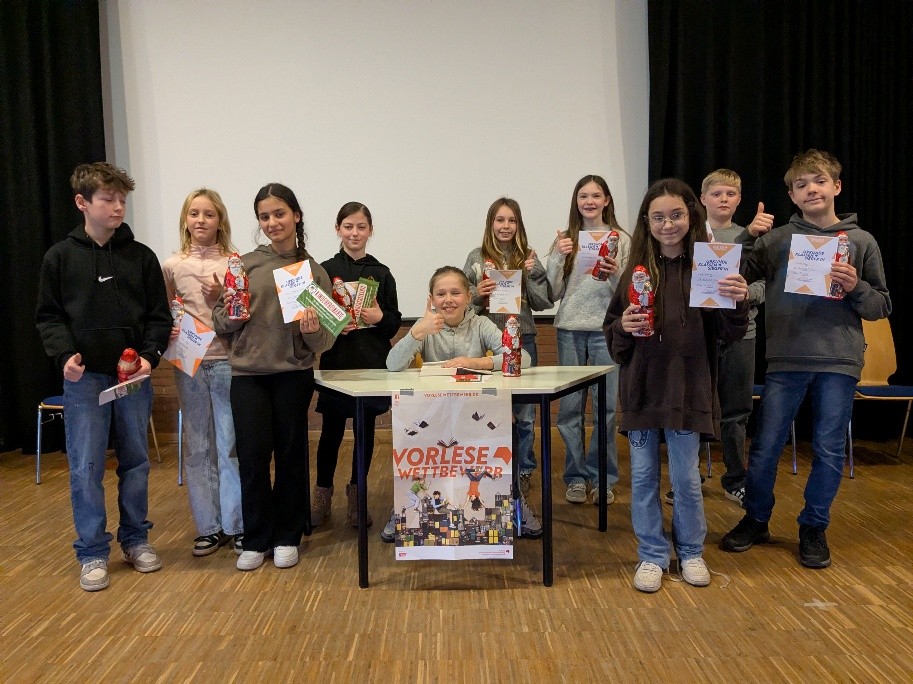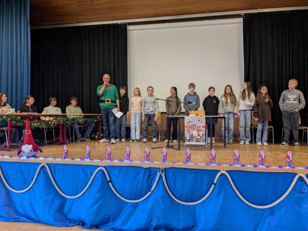 Am Freitag, den 5. Dezember, fand in der Aula unserer Schule der alljährliche Vorlesewettbewerb des 6. Jahrgangs statt. In einer feierlichen und zugleich erwartungsvollen Atmosphäre versammelten sich alle Schülerinnen und Schüler des Jahrgangs, um ihre jeweiligen Klassensiegerinnen und Klassensieger lautstark zu unterstützen.